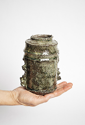 "Just outside Paris, where I live, millstone houses dominate the landscape. And yet, there are pockets of nature to be found from trees whose blossoms colour the streets pink or white in spring, and a little while later little explosions of red dot a background of urban yellow and beige: poppies that pop up wherever they want. I capture these little niches of nature in an urban setting in a vessel of black stoneware."